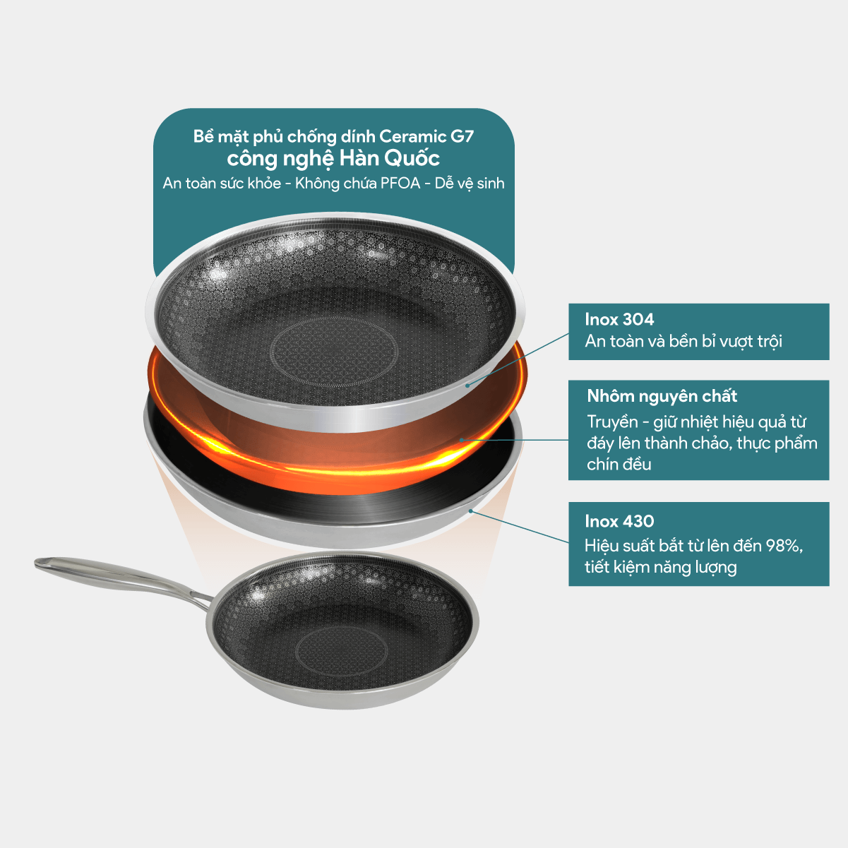 + Lớp phủ lòng chảo: Chống dính Ceramic G7