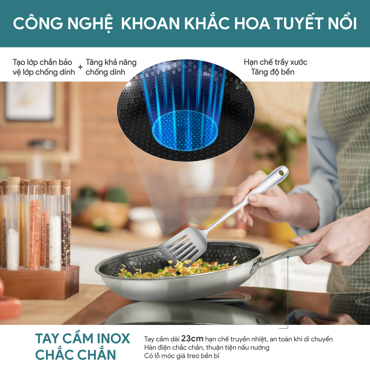 + Công nghệ khoan khắc hoa tuyết nổi tạo thành lớp che chắn và bảo vệ trên bề mặt lớp chống dính. Tăng độ bền và hạn chế xước, bong tróc khi sử dụng.